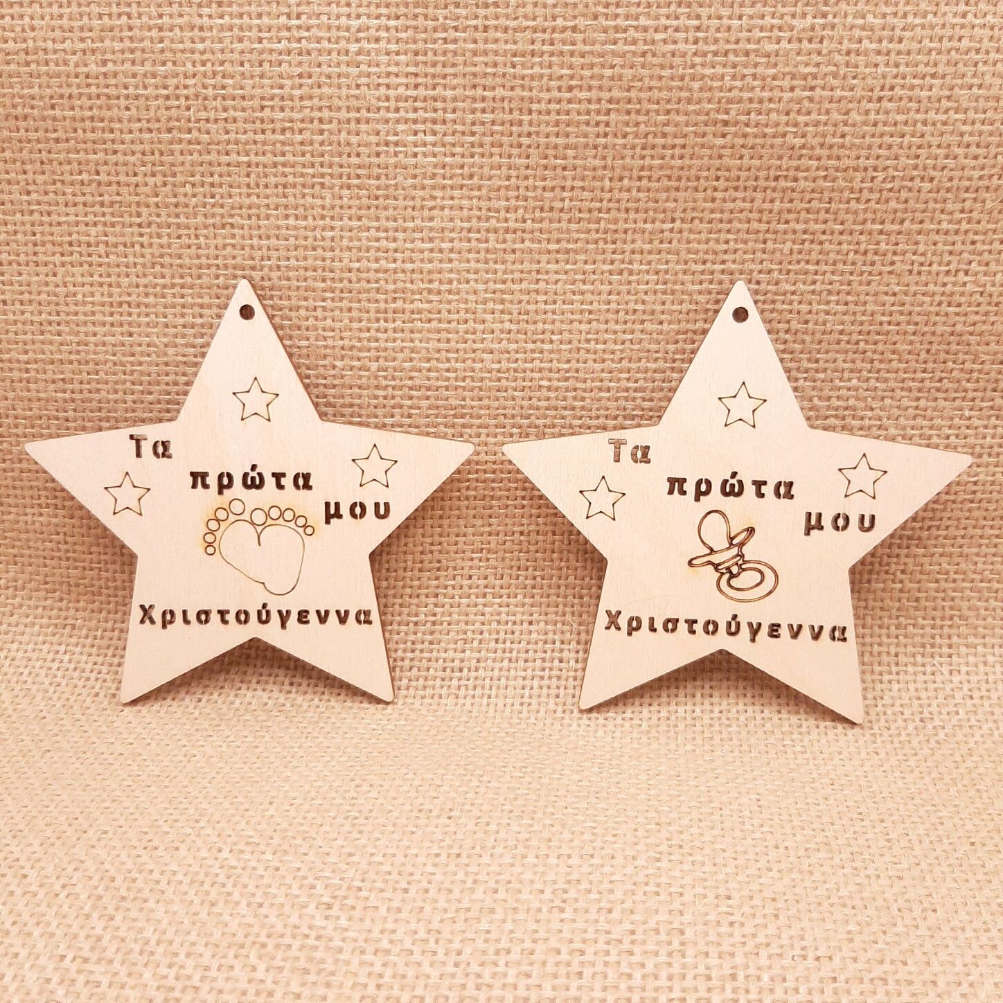 Αστέρι 10cm “Τα πρώτα μου Χριστούγεννα”, σε 2 σχέδια, διάτρητο,σε κόντρα πλακέ συμήδα πάχους 3mm
