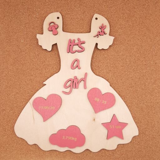 Ενθύμιο γέννησης-φορεματάκι 17χ20cm ,βαμμένο σε κόντρα πλακέ σημύδα πάχους 3mm.