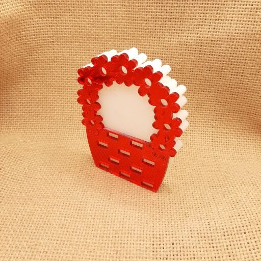 Επιτραπέζιο καλάθι 8x10cm με plexiglass πάχους 10mm, με διάτρητα λουλούδια σε κόκκινο καθρέφτη πάχους 3mm.