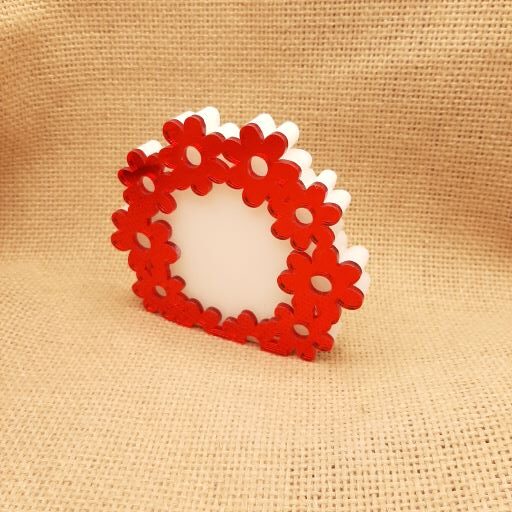 Επιτραπέζιο στεφάνι 10×8.5cm με plexiglass πάχους 10mm, με διάτρητα λουλούδια σε κόκκινο καθρέφτη πάχους 3mm.