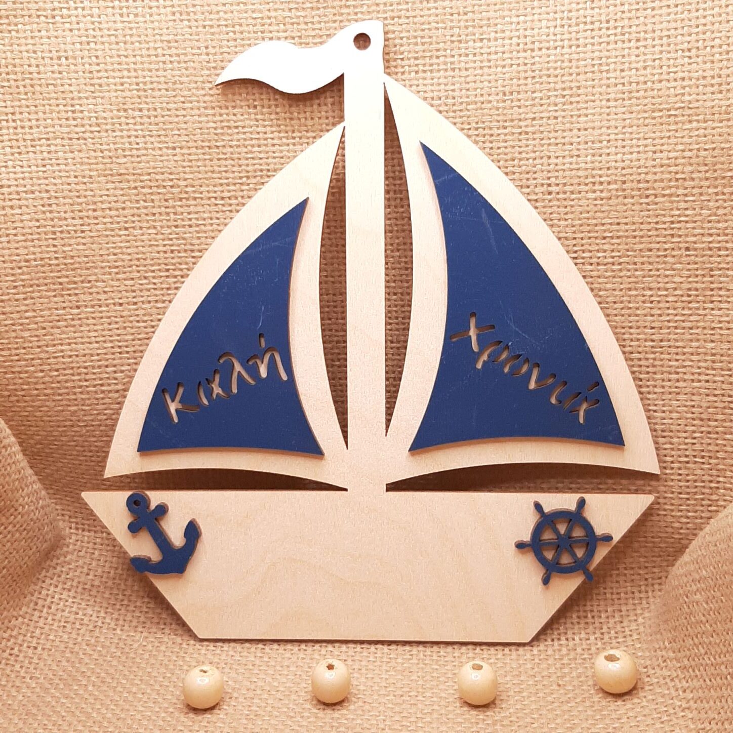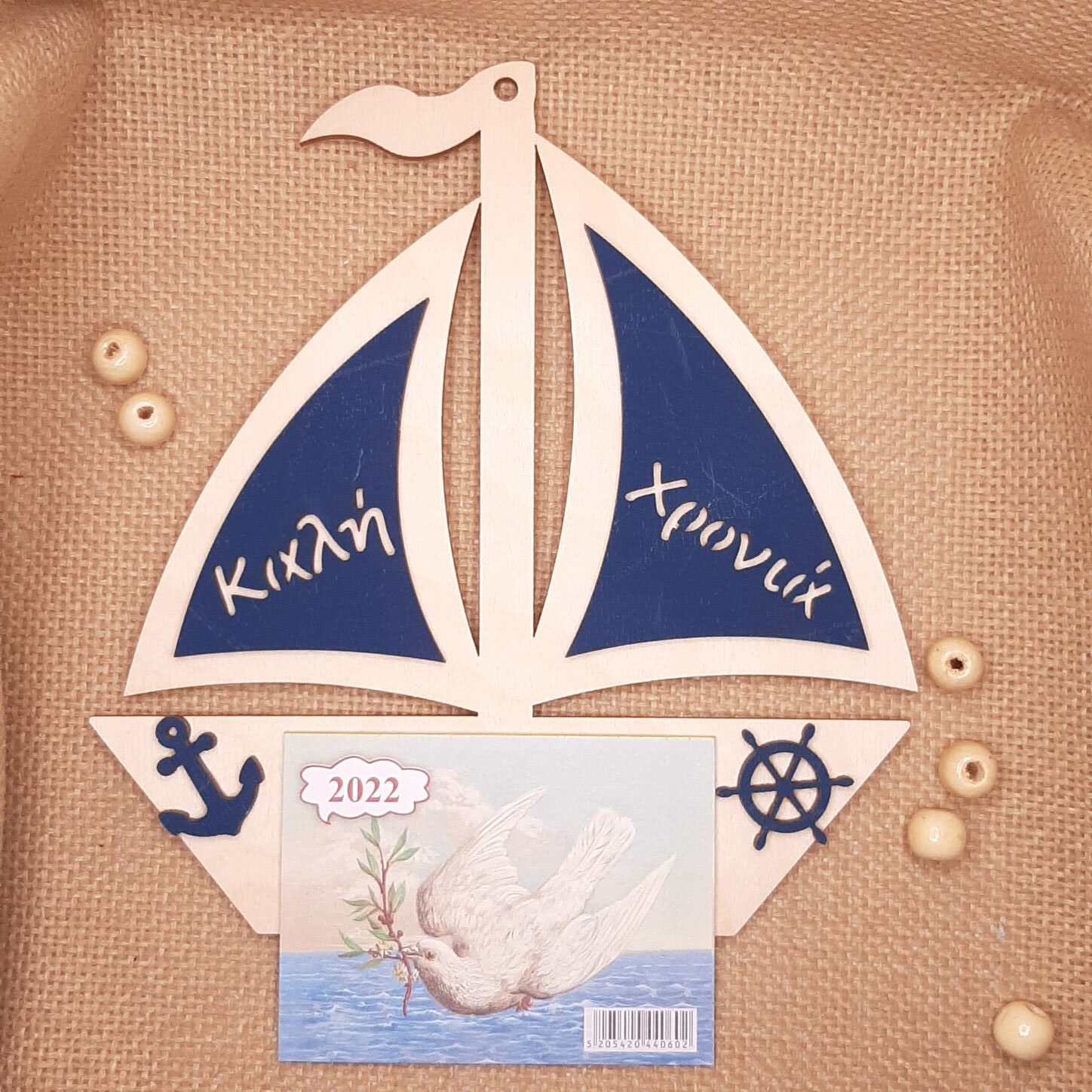Ημερολόγιο καράβι  διάστασης 18x19cm, διπλό,βαμμένο με διάτρητο “Καλή Χρονιά” σε κόντρα πλακέ σημύδα πάχους 3mm.