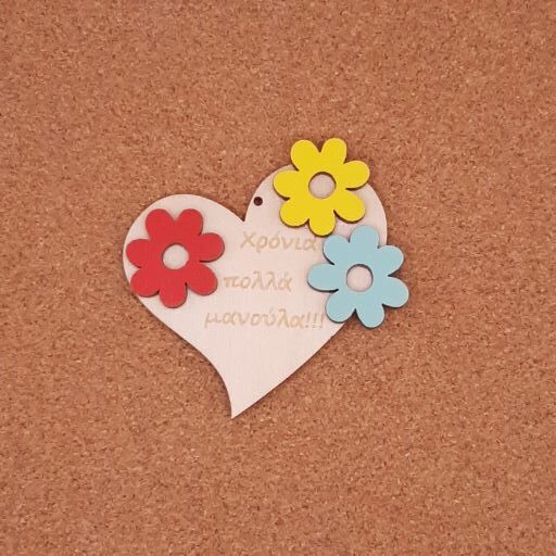 Καρδιά με χάραξη “Χρόνια πολλά μανούλα” διάστασης 6.5cm, διπλή με λουλούδια, σε κόντρα πλακέ σημύδα πάχους 3mm