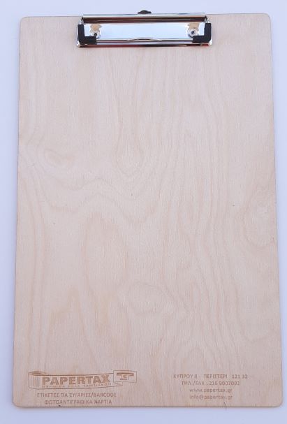 Κατάλογος με πιάστρα -Πινακίδα παρουσίασης, διάστασης 22x34cm,με χάραξη στοιχείων στο κάτω μέρος σε κόντρα πλακέ σημύδα πάχους 3mm .