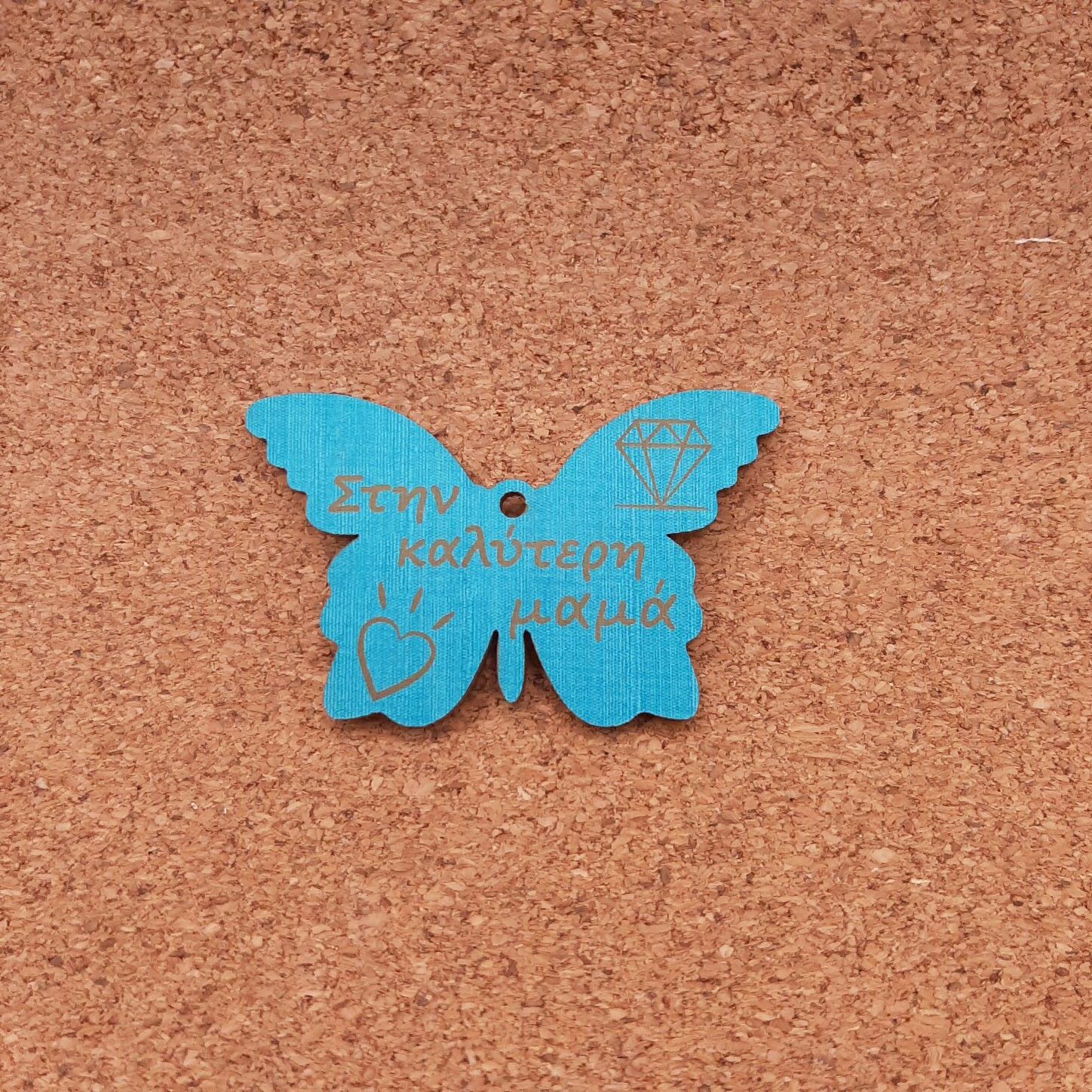 Κόσμημα πεταλούδα 4,5χ4cm με ύφασμα και χάραξη αφιέρωσης “στην καλύτερη (επιλέγετε κείμενο)” σε κόντρα πλακέ σημύδα 3mm