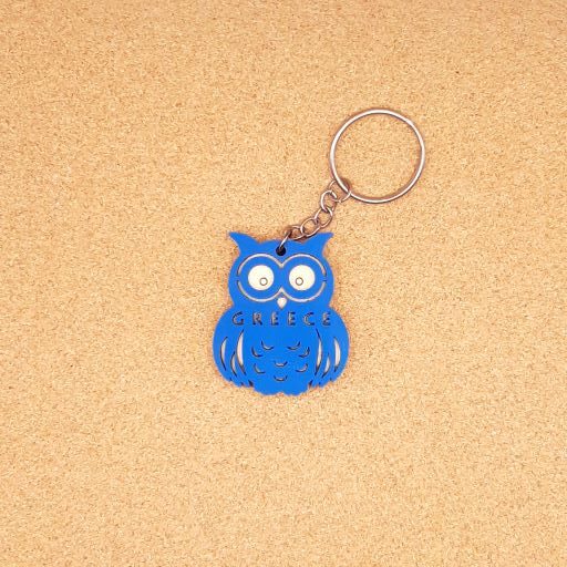 Μπρελόκ-κουκουβάγια “GREECE” διάστασης 4χ5cm, διπλό,βαμμένο σε κόντρα πλακέ σημύδα πάχους 3mm.