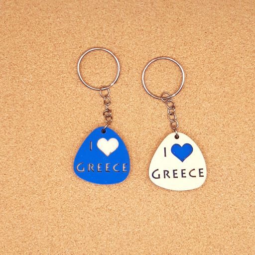Μπρελόκ σε σχήμα πέτρας “I LOVE GREECE”  διάστασης 4×4cm, διπλό,βαμμένο σε κόντρα πλακέ σημύδα πάχους 3mm.Διατίθεται σε φυσικό και σε βαμμένο.