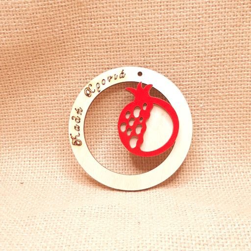 Στεφάνι 8cm με σκάλισμα “Καλή Χρονιά” και ρόδι διάτρητο βελούδο , σε ξύλο κόντρα πλακέ σημύδα πάχους 3mm