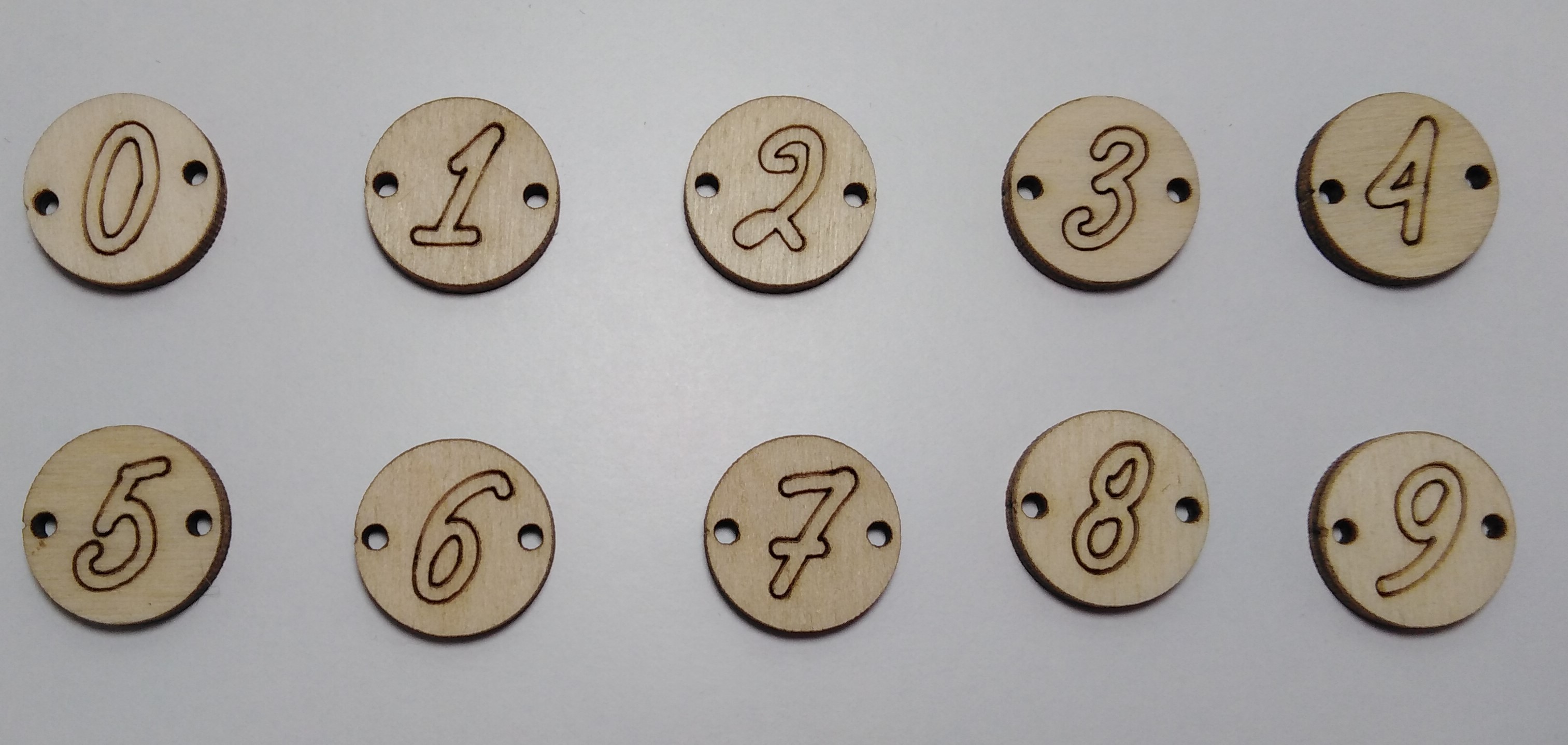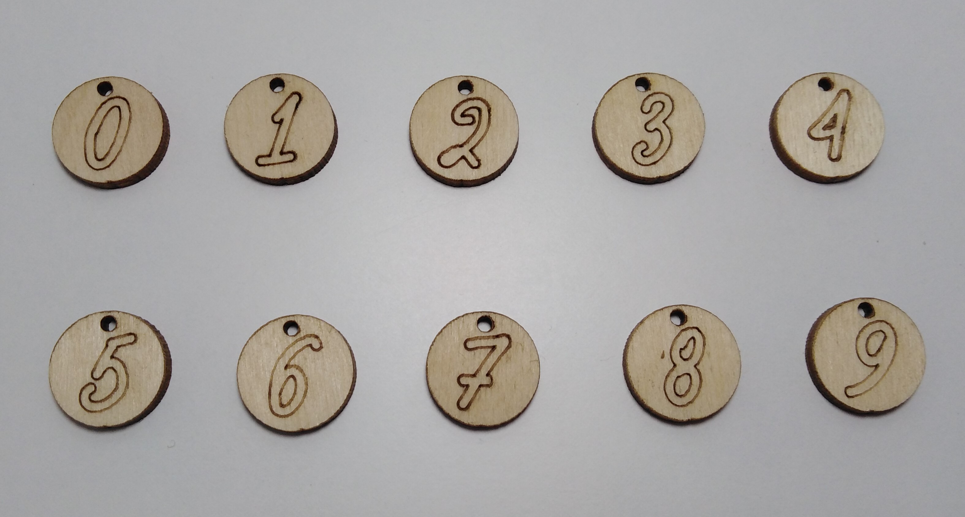 Στρογγυλό “0-9” με σκάλισμα διαμέτρου 1,7cm ιδανικό για βραχιόλι ή κολιέ ,σε ξύλο κόντρα πλακέ σημύδα πάχους 3mm